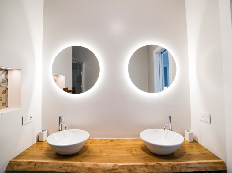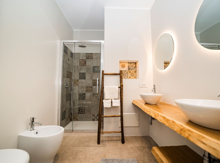 I servizi, moderni e ben rifiniti, sono dotati di sanitari sospesi, box doccia e rivestimenti contemporanei, con una progettazione pensata per garantire comfort e praticità sia per uso residenziale sia per ospitalità.